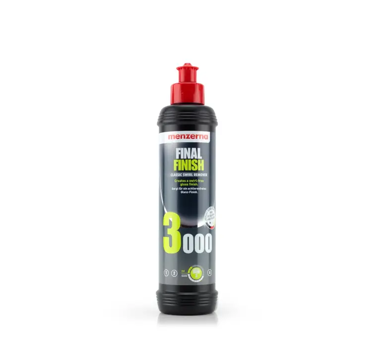 Menzerna Final Finish 3000 contains fine abrasives to remove slight marks and to burnish the paintwork to a high gloss. For best results use on a finishing pad with a machine polisher on a medium speed. With minimal residue left over from working it there is less chance of introducing marks back into the paintwork from over buffing.